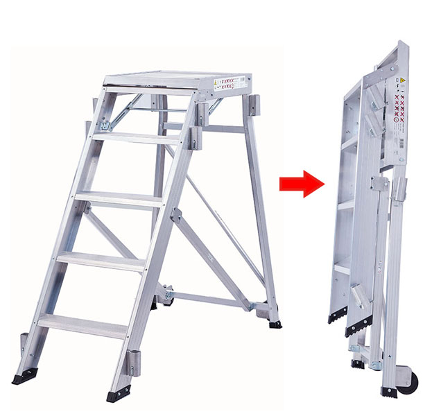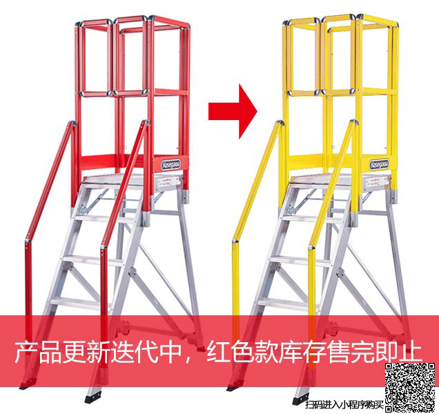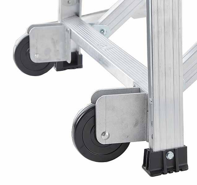主体一件收叠延展无需组装、半自助移动式登高作业台,2个定向后脚轮便于移动。