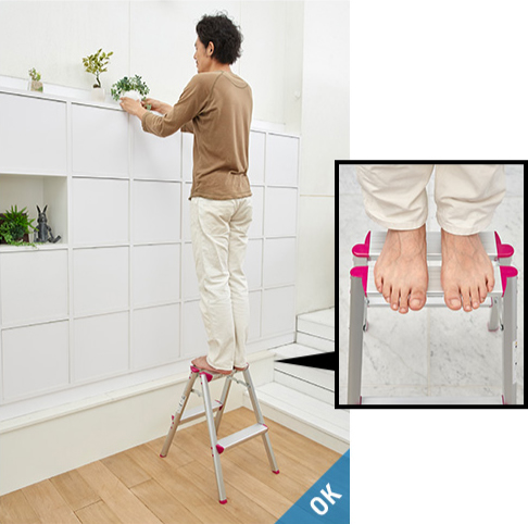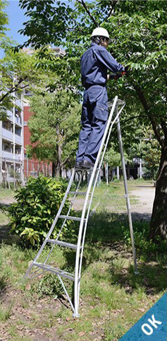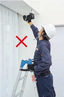 - 在梯子上进行作业时,请站在从天板开始数第三节(210cm以下的型号则为第二节)以下的踏板上,身体轻靠天板和上层踏板,在平稳的状态下操作。