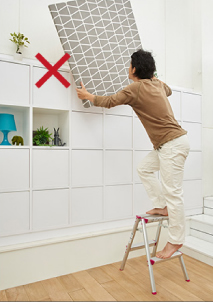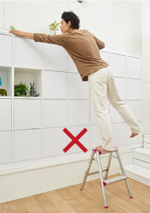 - 在三脚梯上进行作业时,请站在从天板开始数第四节(180cm以下的型号则为第三节)以下的踏板上,身体轻靠天板和上层踏板,在平稳的状态下操作。